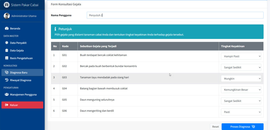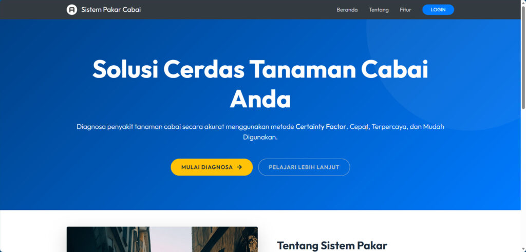 Aplikasi Sistem Pakar ini merupakan solusi digital inovatif yang dirancang khusus untuk membantu petani, praktisi pertanian, dan akademisi dalam mengidentifikasi berbagai jenis penyakit pada tanaman cabai secara dini, cepat, dan akurat. Menggunakan fondasi logika kecerdasan buatan dengan metode Certainty Factor (CF), sistem ini mensimulasikan kepakaran seorang ahli pertanian dalam mengolah gejala-gejala klinis yang ditemukan di lapangan menjadi sebuah kesimpulan diagnosa yang disertai dengan tingkat kepercayaan (persentase kepastian).