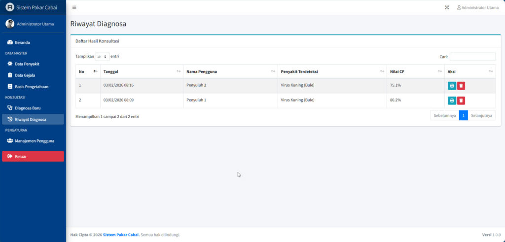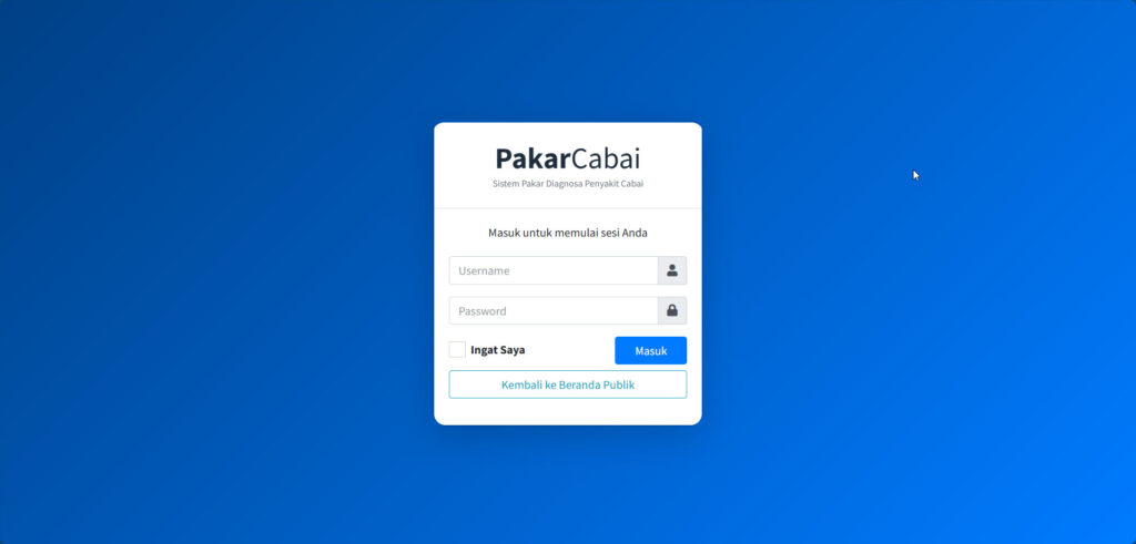 Aplikasi Sistem Pakar Diagnosa Penyakit Tanaman Cabai berbasis Certainty Factor (CF) ini juga memiliki nilai akademik yang kuat sehingga sangat layak dijadikan ide atau objek penelitian skripsi bagi mahasiswa Teknik Informatika, Sistem Informasi, Ilmu Komputer, maupun bidang komputer lainnya. Sistem ini mengintegrasikan konsep kecerdasan buatan (Artificial Intelligence), representasi pengetahuan, mesin inferensi, serta pengembangan aplikasi web berbasis data, yang merupakan kompetensi inti dalam kurikulum bidang komputasi. Mahasiswa dapat mengangkat berbagai fokus penelitian, seperti analisis akurasi metode Certainty Factor, perbandingan dengan metode sistem pakar lain (Forward Chaining, Dempster-Shafer, atau Fuzzy), pengujian usability sistem, hingga pengembangan fitur lanjutan berbasis mobile atau IoT pertanian. Dengan demikian, aplikasi ini tidak hanya bermanfaat secara praktis bagi sektor pertanian, tetapi juga bernilai ilmiah tinggi sebagai judul skripsi aplikatif dan relevan dengan kebutuhan dunia nyata.