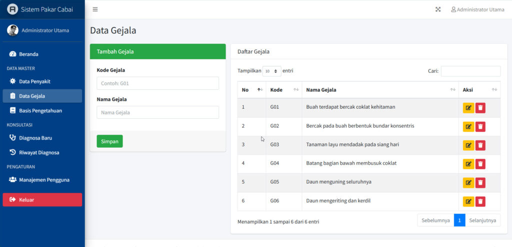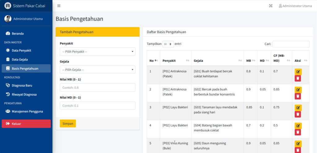- Manajemen Basis Pengetahuan Dinamis: Memungkinkan pakar untuk mengelola data penyakit, gejala, serta bobot keyakinan (MB & MD) tanpa melalui perubahan kode program (data-driven).