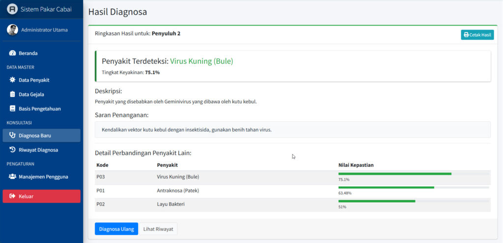 - Laporan Diagnosa Profesional: Fitur cetak hasil diagnosa yang dilengkapi dengan Lampiran KOP Resmi, Deskripsi Penyakit, dan Saran Penanganan/Solusi praktis dari pakar.