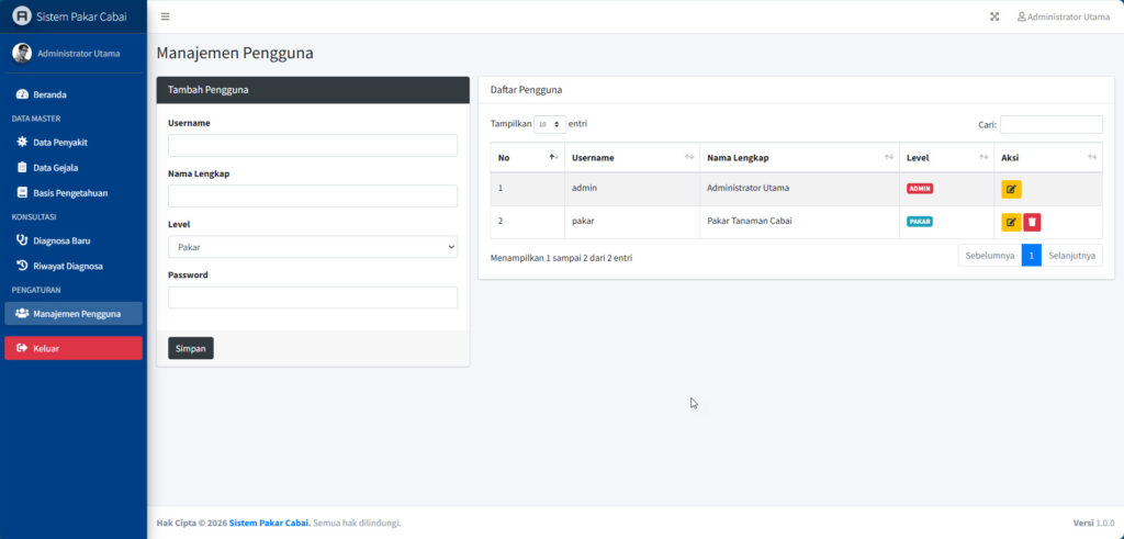 - Manajemen Akun Multi-Level: Pengaturan hak akses yang jelas antara Administrator (pengelola sistem) dan Pakar (pengelola pengetahuan).