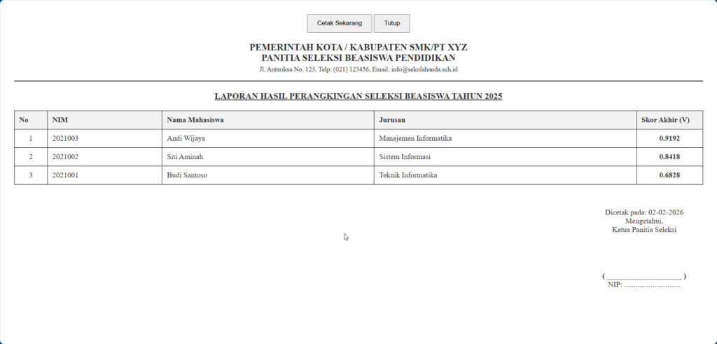 - Langkah 5: Lihat hasil akhir dan cetak laporan pada menu “Hasil Perangkingan”.