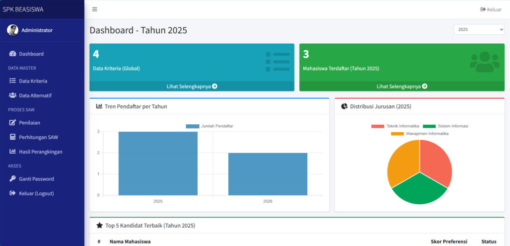 Anda sedang mencari aplikasi untuk skripsi, aplikasi spk untuk skripsi, spk saw, spk beasiswa, aplikasi spk berbasis web? Ya anda sudah benar berada di sini. Ini adalah Aplikasi Sistem Pendukung Keputusan (SPK) Pemilihan Penerima Beasiswa menggunakan metode Simple Additive Weighting (SAW). Tersedia Source Code atau Kode Siap Aplikasi SPK Beasiswa SAW.