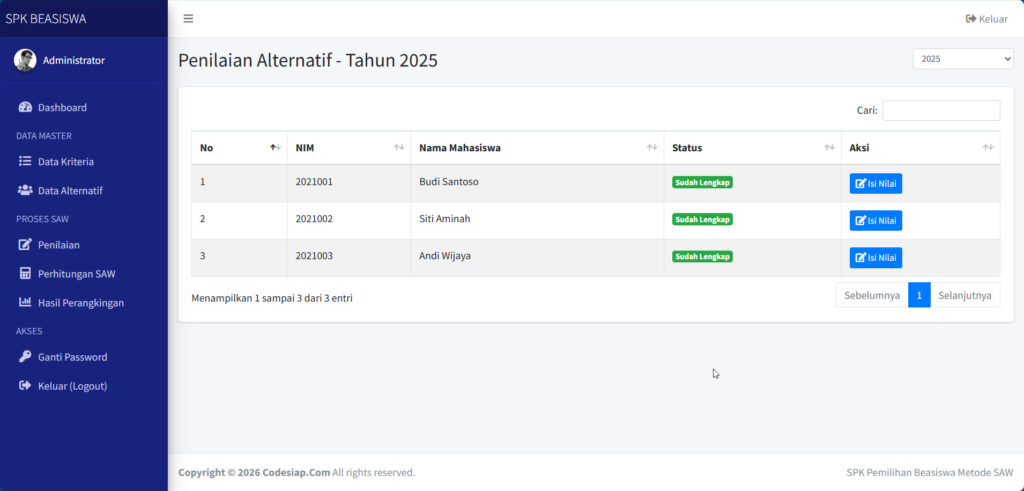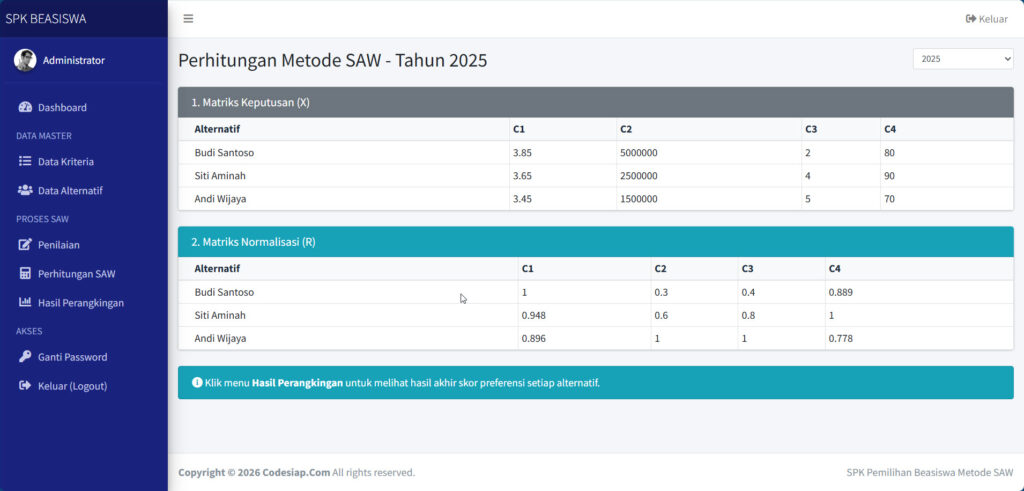 - Langkah 4: Pantau perhitungan pada menu “Perhitungan SAW” (pastikan filter tahun sudah benar).