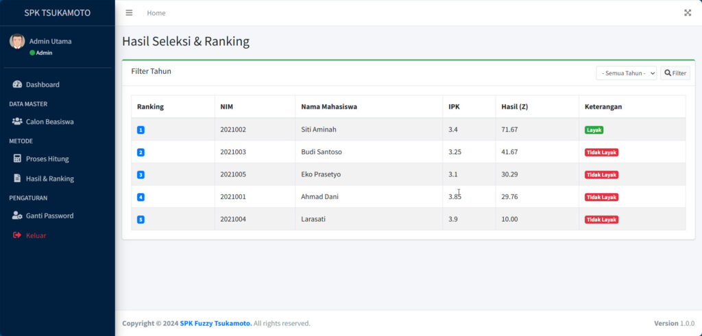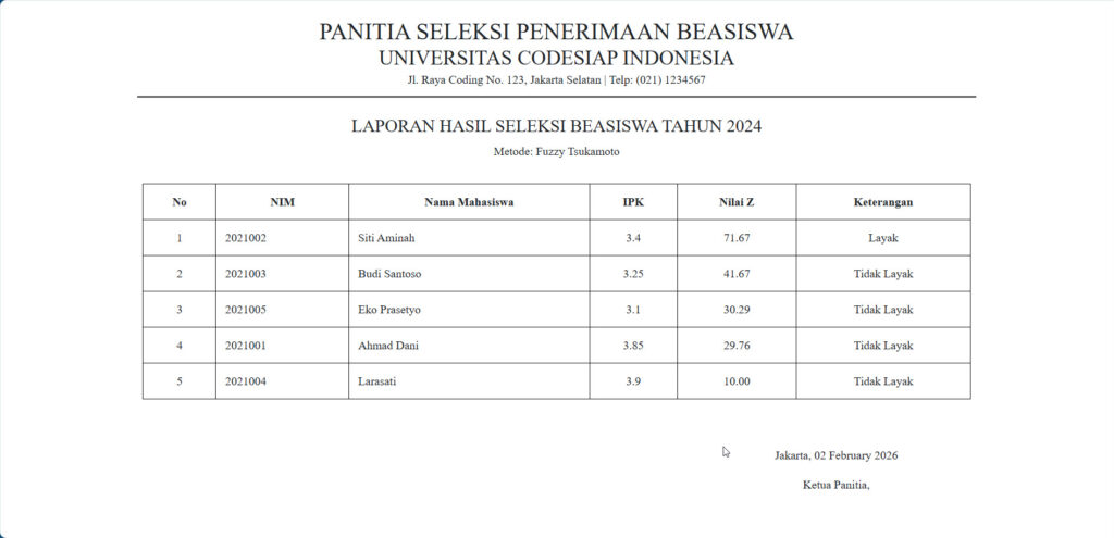 - Ranking & Keputusan: Penyajian hasil seleksi berdasarkan urutan nilai Z tertinggi ke terendah.