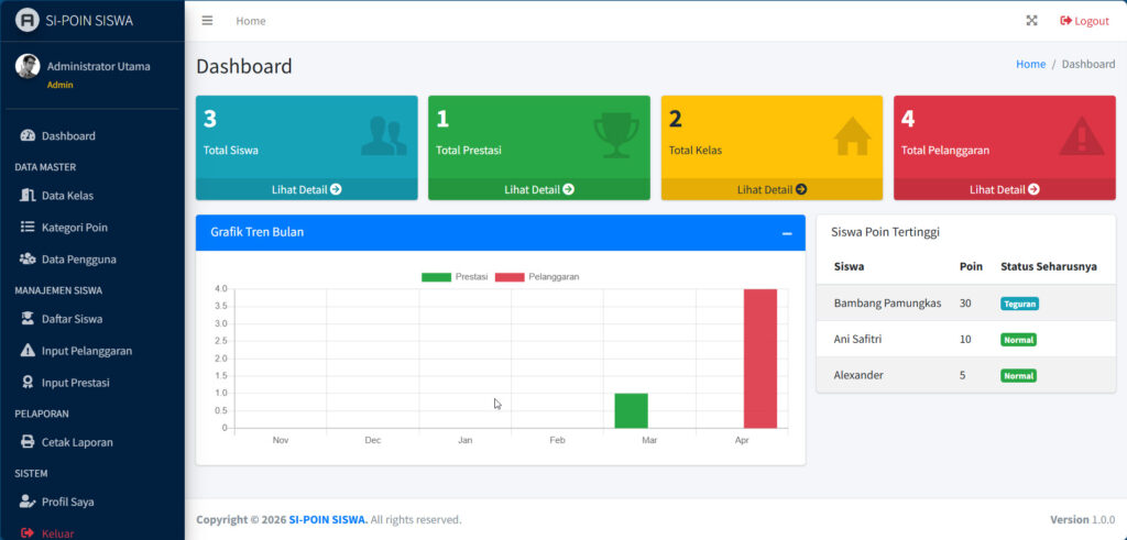 - Siswa/Orang Tua: Melihat riwayat poin dan status kedisiplinan secara transparan melalui portal mandiri.