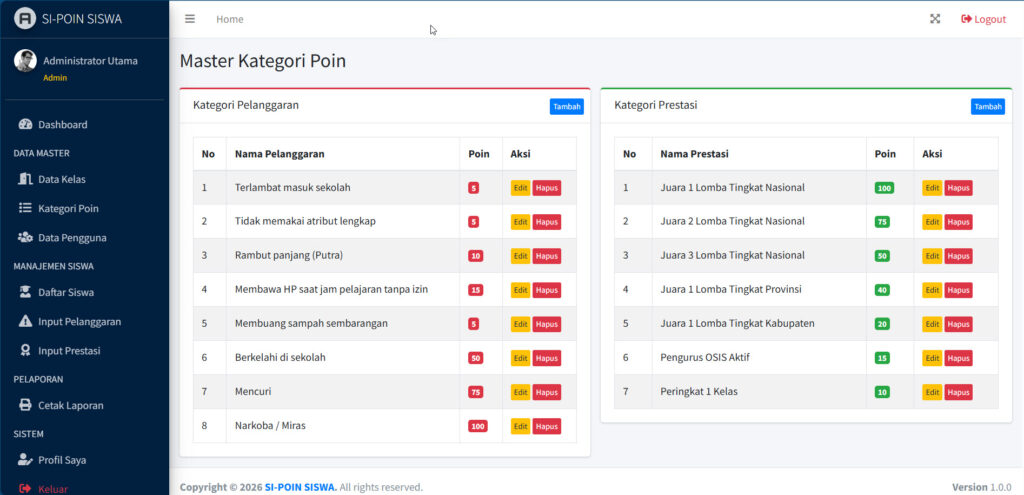 - Admin: Mengontrol seluruh data master kelas, kategori poin, dan manajemen pengguna.