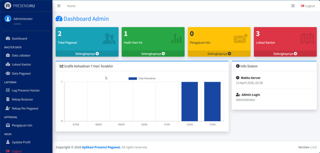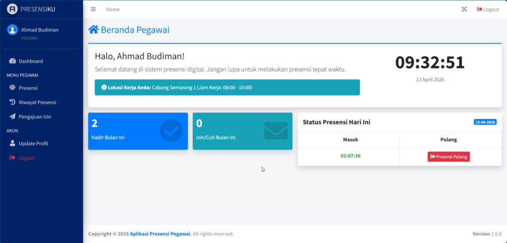 Berikut ini beberapa screenshot tampilan aplikasi presensi pegawai berbasis PHP dan MySQLi yang mendukung fitur lokasi dan foto.