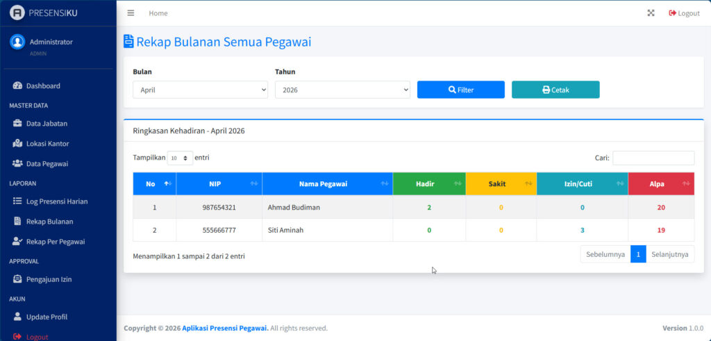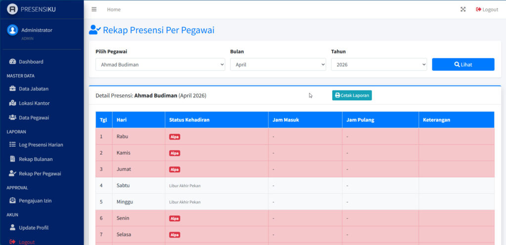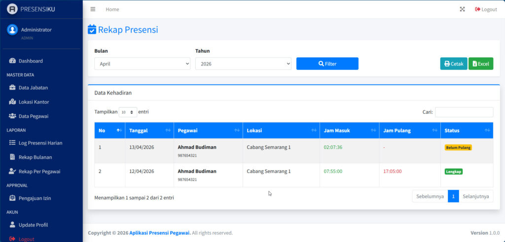 - Laporan Siap Pakai: Rekap harian, bulanan, dan detail individu yang rapi.