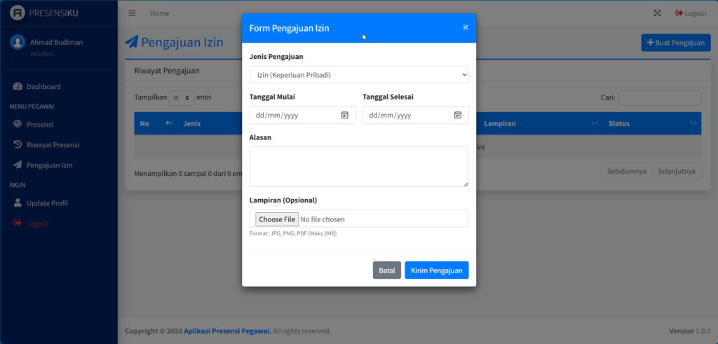 - Izin & Cuti Digital: Pengajuan mandiri oleh pegawai lengkap dengan upload lampiran bukti.